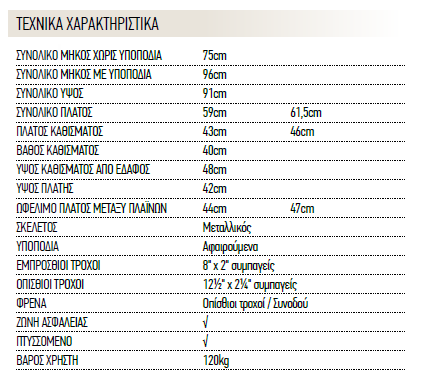 Πτυσσόμενο αμαξίδιο μεταφοράς με μεταλλικό σκελετό ακρυλικής βαφής. Πλαϊνά τύπου "Flip-up". Υποπόδια αφαιρούμενα και ρυθμιζόμενα. Φέρει φρένα συνοδού και ζώνη ασφαλείας.